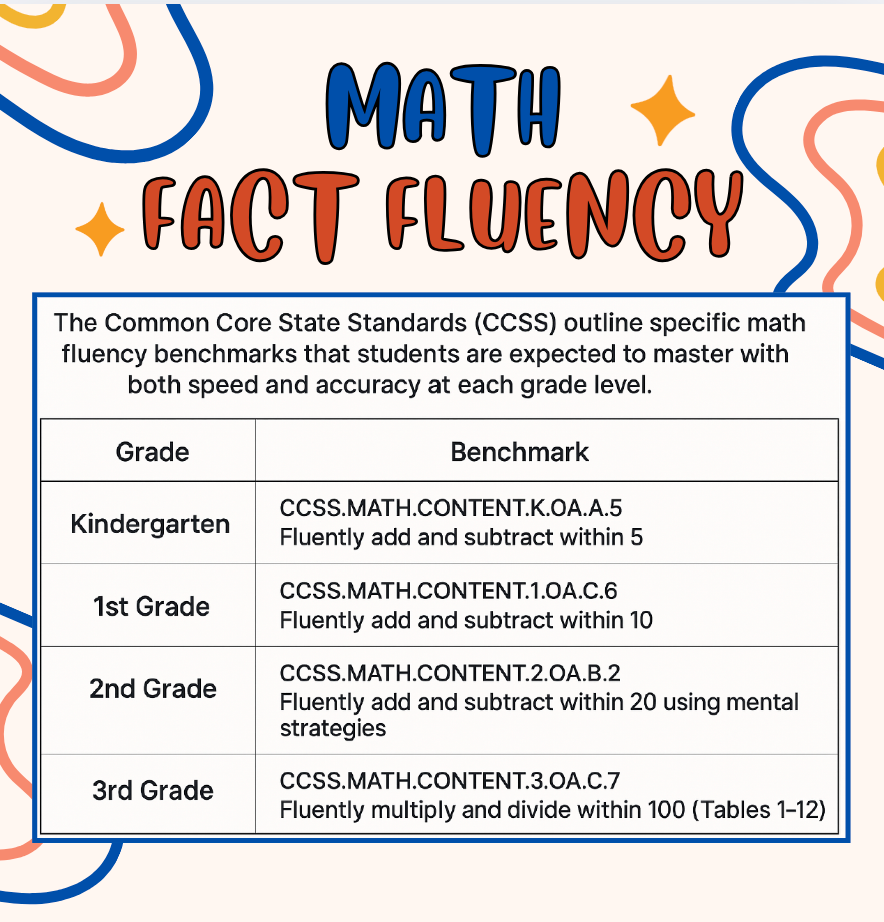 This means that students should be able to recall basic math facts quickly and effortlessly, without counting on fingers. This skill forms the foundation for all future math learning. When students lack fluency, they may struggle as more complex concepts build on these basics. But with it, they approach math with confidence, competence, and readiness to excel